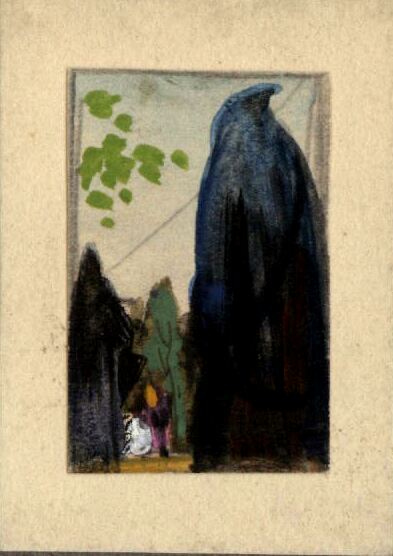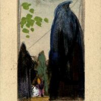 - Con el fondo de un paisaje de árboles y hojas verdes se ven dos figuras negras encapuchadas, una en primer plano y la otra más alejada. El dibujo está enmarcado en un cuadrado pequeño en el centro.