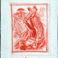 - En el dibujo enmarcado donde destacan los tonos rojizos se ve la figura de un torero que cae y es cogido por un toro. Detrás, en segundo plano, destaca la imagen de otro torero.