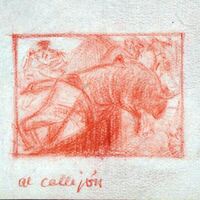 - En esta escena enmarcada y en tonos rojizos se representa la salida del toro a la arena de la plaza. En la imagen se ve también la presencia de toreros.
