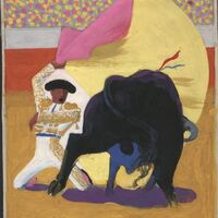 - Este dibujo desarrolla una escena taurina en la que un torero de rodillas en la arena de la plaza despliega su capa, dejándose ver su interior amarillo, en el momento de torear al toro negro que se muestra de espalda. Alrededor de esta imagen se adivinan las gradas con una gran multitud de gente asistiendo al espectáculo.