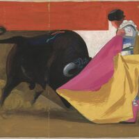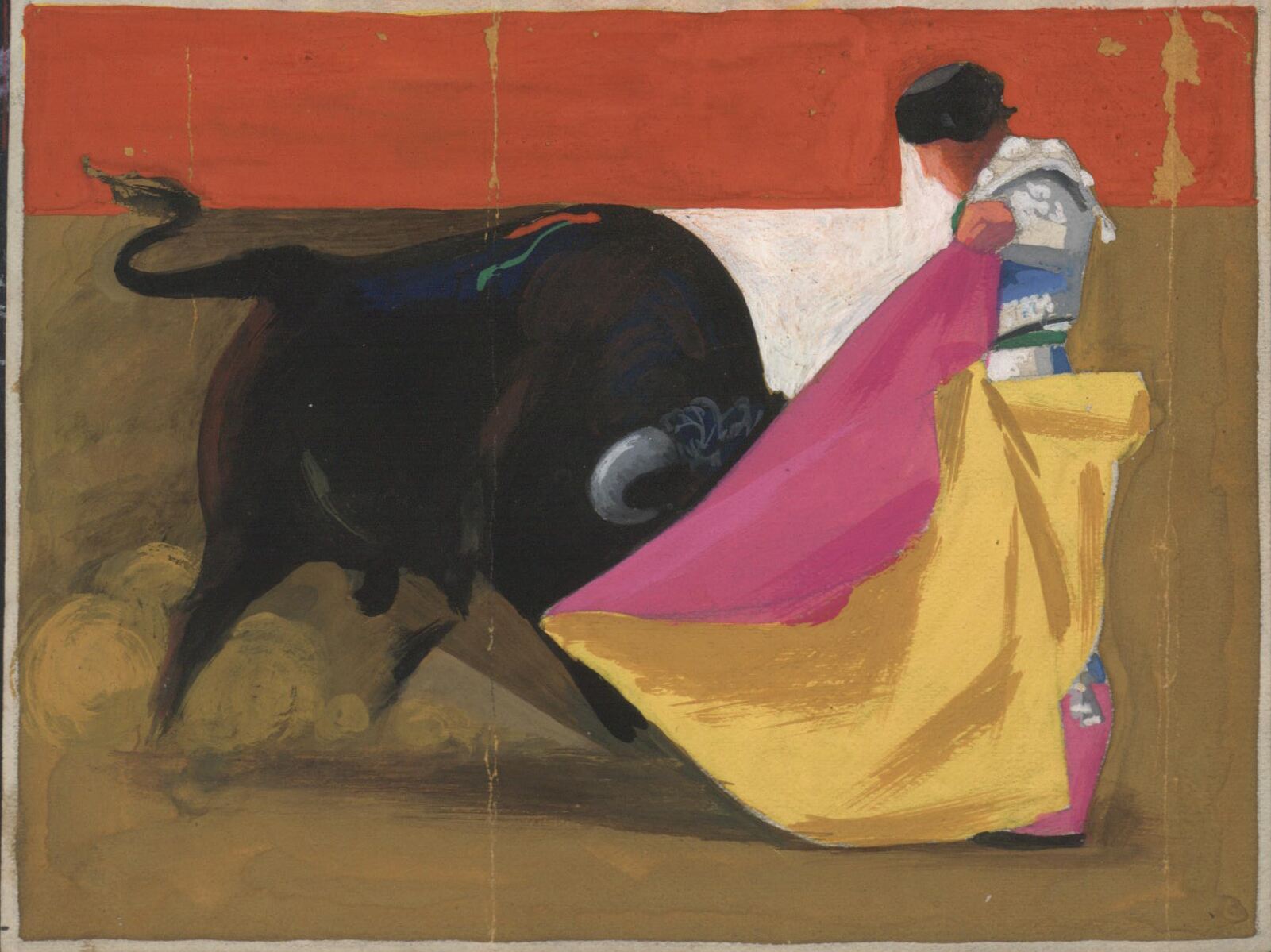 - En la escena taurina que se desenvuelve en este dibujo, en el que predomina el rojo y el marrón de la arena de la plaza, se ve un torero con traje azul y con la capa rosa y amarilla toreando a un toro negro. Ambas figuras están de perfil.