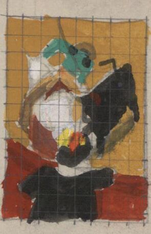 En este dibujo enmarcado y con la superficie cuadriculada se muestra una mujer de espalda con el traje negro y detrás de las gradas observando como un rejoneador sobre el caballo blanco, de espalda también, clava su lanza a un toro negro. En el fondo del dibujo destaca el amarillo de la arena de la plaza.