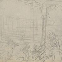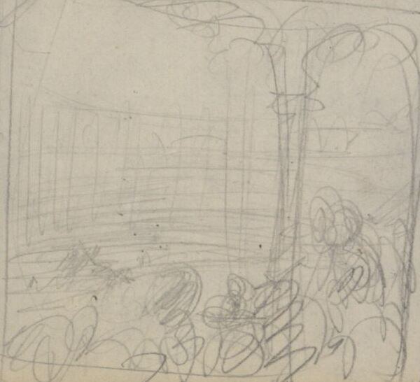 - Primer boceto a lápiz, de una perspectiva de un arco sobre una columna desde donde se observa una panorámica del ruedo y las cabezas de los espectadores. Es posible que sea un estudio para una medalla.