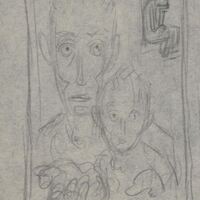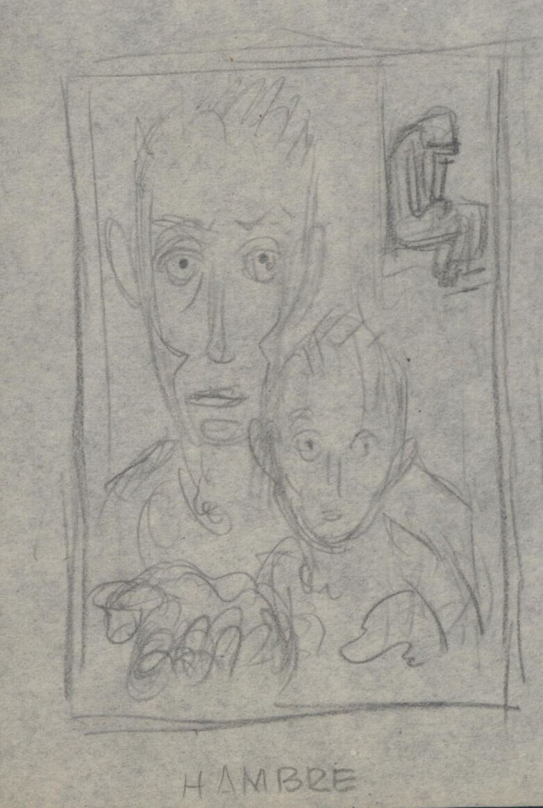 - Boceto a lápiz, con la imagen en primer término de un hombre famélico junto a un niño, con la mano extendida pidiendo ayuda, y en la esquina superior la figura de una persona sentada con las manos en la cara con aptitud de sufrimiento.