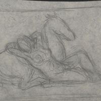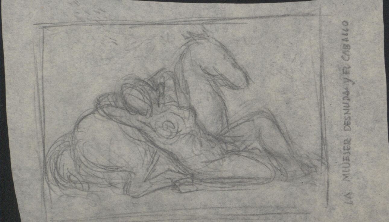 - Primer boceto apaisado de la imagen de una mujer desnuda recostada sobre el lomo de un caballo sentado sobre sus patas.