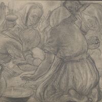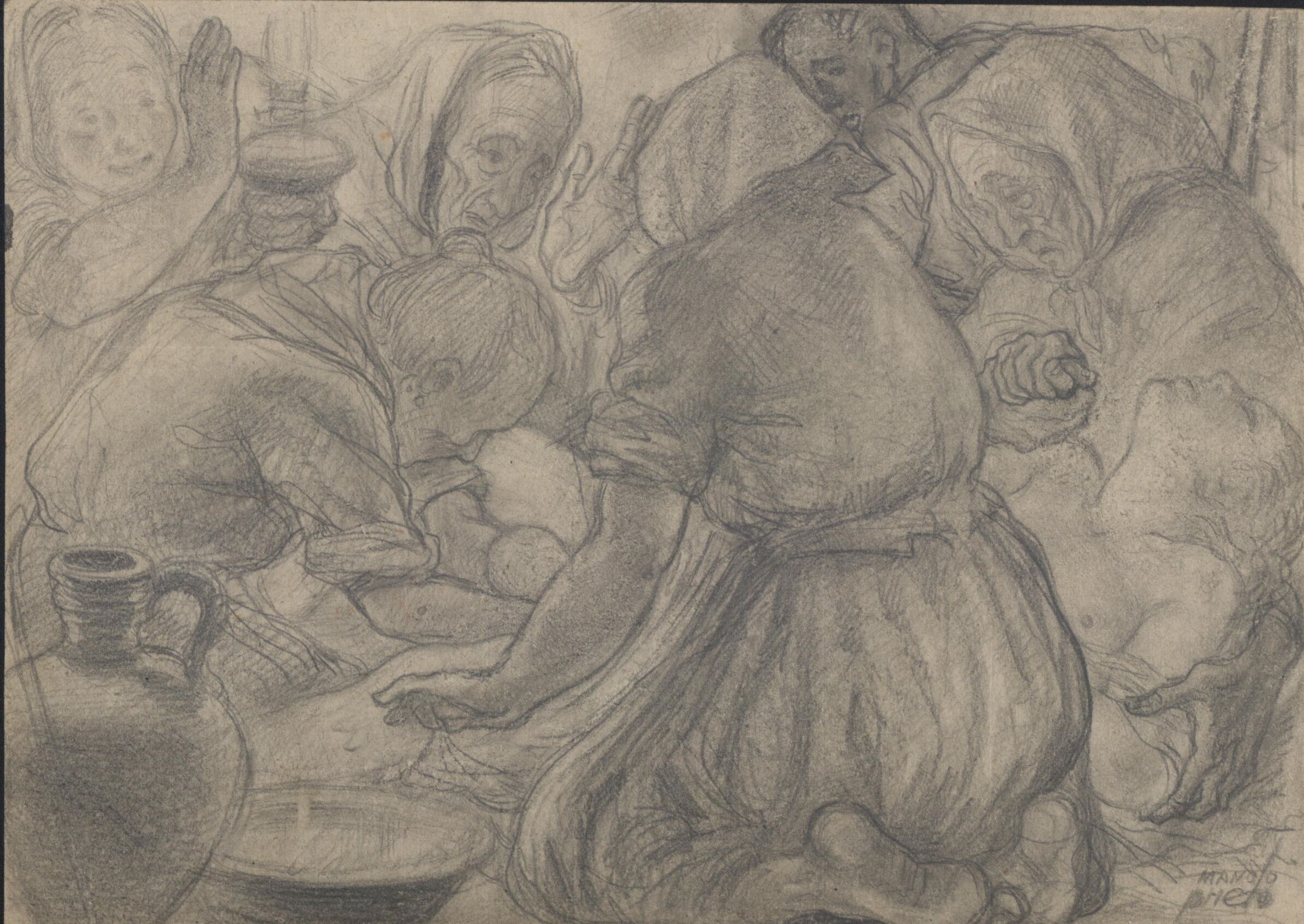 - Dibujo de una mujer dando a luz, rodeada de mujeres mayores con pañuelo en la cabeza que acompañan a la mujer en ese momento complejo, unas como comadronas ayudando a que todo salga bien, otras meramente observando con su rostro iluminado por la alegría, y por último la figura de un hombre con las mangas de la camisa remangadas atendiendo el parto.