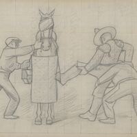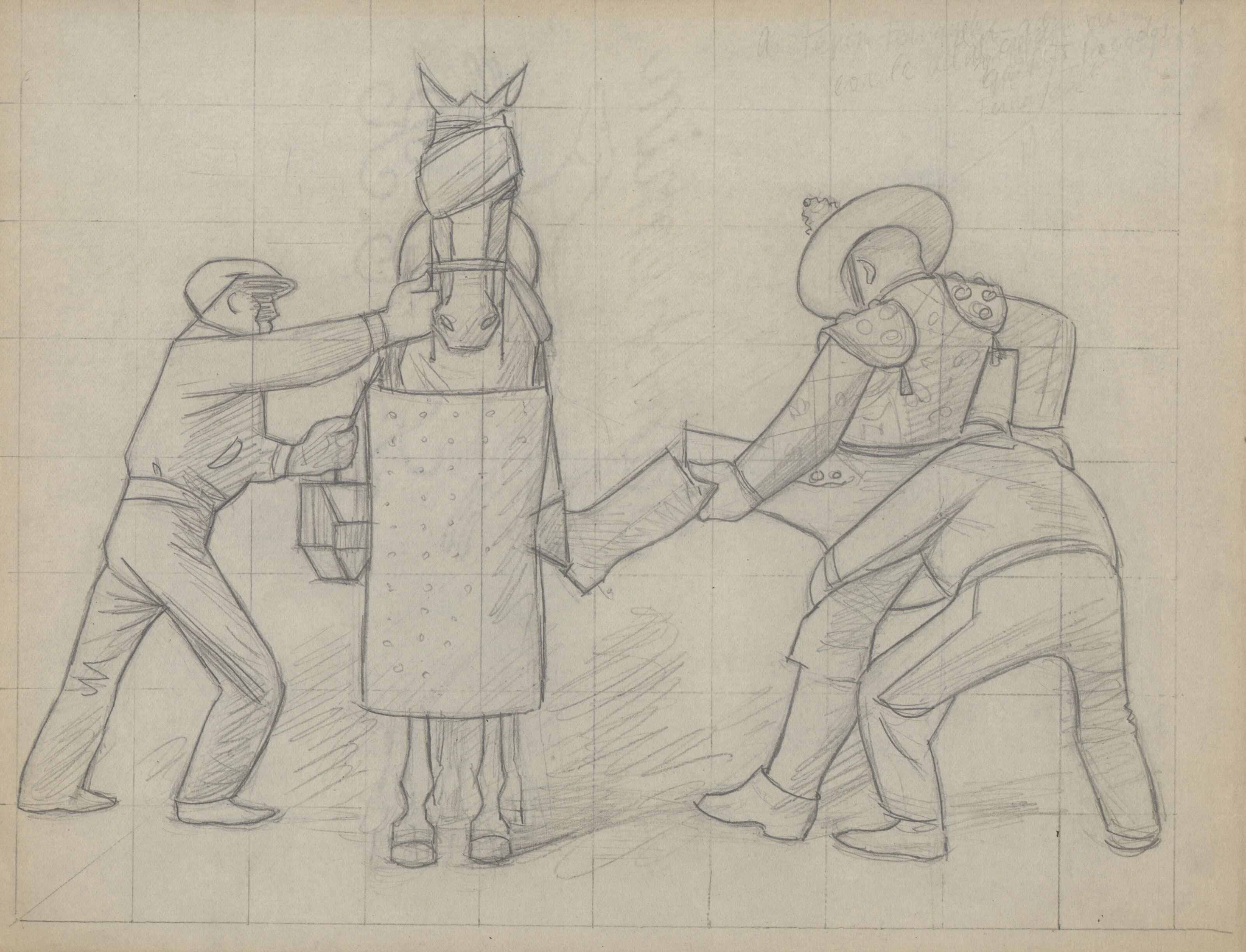 - El boceto que representa la escena de un picador apoyado sobre los hombros de un mozo que le ayuda a subir al caballo que a su vez está sujeto por otro mozo. El uno de los bocetos cuadriculados de lo que luego llegaría a ser un cuadro.