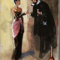 Cartel que está divido en dos ambientes distintos sobre dos fondos contrastados, en las que en cada una de ellas están personajes representando diferentes épocas, conversando entre sí, en el lado de la izquierda una figura femenina de época actual vestida elegantemente con un traje de noche que conversa con un caballero de época vestido rigurosamente de negro, debajo de los personajes del cartel las letras “Casay” con la imagen de una botella.