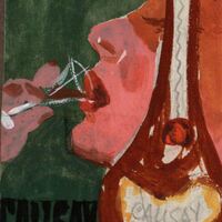 - Cartel sobre fondo verde oscuro, con un perfil del rostro de una mujer bebiendo de una copa, en primer término una botella con la etiqueta y al lado el nombre de la marca de la bebida.