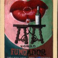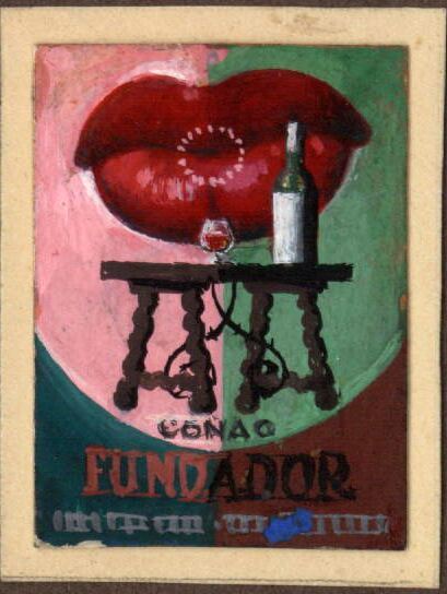 - Imagen de fondo de los labios rojos de una mujer, divido en dos mitades, fondo rosa fondo verde claro, sobre esta imagen una mesa de patas torneadas donde se encuentran una copa y una botella, debajo de todo ello la leyenda “Coñac Fundador”.