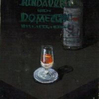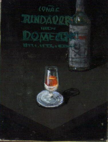 - Sobre un fondo oscuro, imagen de la esquina de una mesa y sobre ella en primer término una copa de coñac y detrás una botella, y en la parte superior de la escena la leyenda.