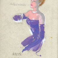 - Sobre un fondo claro, la imagen de una mujer vestida elegantemente con vestido de noche y guantes, sujetando una copa de anís, con los rótulos a lápiz negro. De sus labios sale un “buenísimo”.