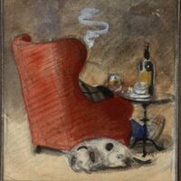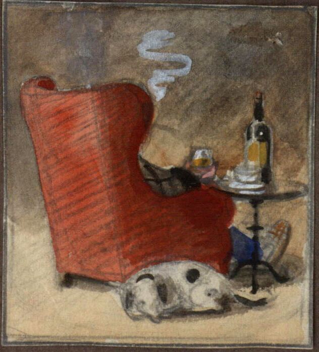 - Bellísima escena que representa un sillón rojo de espaldas desde donde sobresalen un brazo que sujeta una copa y una pierna con zapatillas, a su lado un velador donde se ve una botella y una copa y junto al sillón un perro con manchas blancas y negras durmiendo.