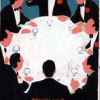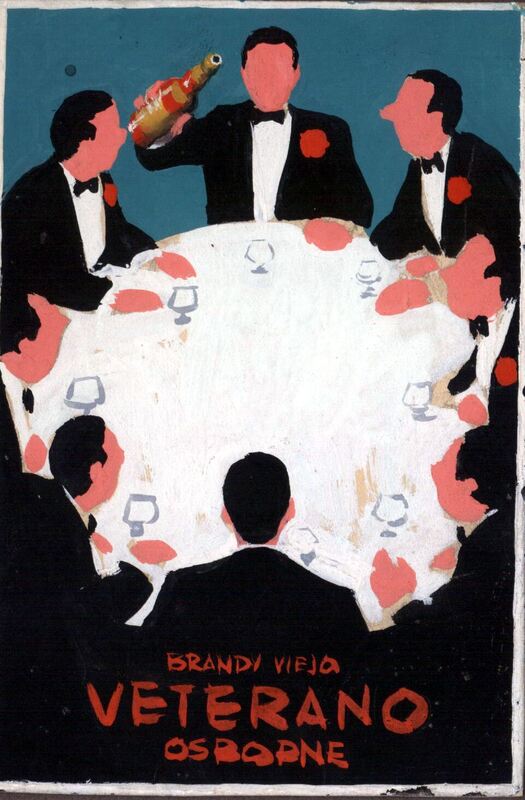 - Cartel donde se representa a un grupo de comensales vestidos de etiqueta con claveles en la solapa, alrededor de una mesa con mantel blanco, uno de ellos que está situado en la cabecera de la mesa, sostiene en su mano una botella .