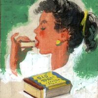 - Imagen de una mujer probando una barra de helado sobre fondo verde, perfilada por un contorno blanco. Tiene gracia como la marca del helado la cubre de una –reconfortante en verano- capa de hielo.