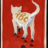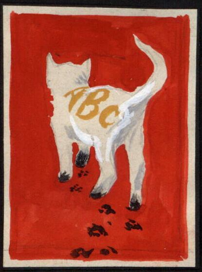 - Sobre un fondo rojo, visto de espaldas, un delicado gato andando, marcando sus pasos con huellas oscura, producidas quizá por la tinta. En su lomo pueden leerse las letras del diario ABC.