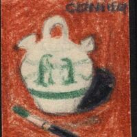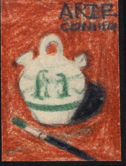 - Un botijo con decoraciones en verde en el centro del dibujo, en primer plano y en la parte superior derecho un rótulo. Que el pincel tengo sus cerdas del mismo color que las decoraciones del botijo, nos habla de representación de manualidades.