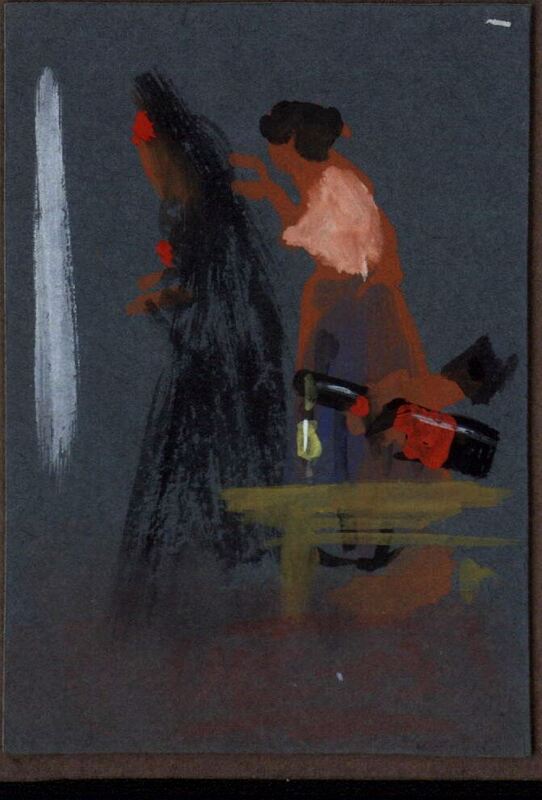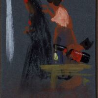 - Cartel con la imagen de dos mujeres, una de ellas vestida con peineta y a su lado una mujer ayudándola a vestirse, en primer término una mano que sujeta una botella de fino quinta llenando una copa.