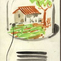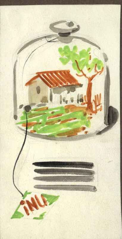 - Boceto en el que se representa la imagen de una casa, junto a un árbol y un jardín a través de un soporte de cristal, debajo un conjunto de líneas que simulan la leyenda que iría escrita y un logotipo romboidal con las esquinas en verde en cuyo centro se lee “INLA”.