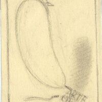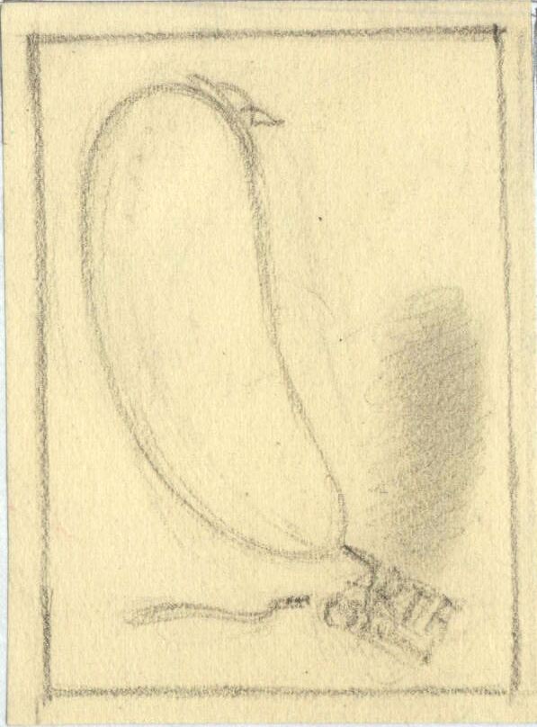 - En un dibujo enmarcado por líneas suaves y bajo el lema de “arte grande”, en la parte inferior, se representa una figura, hacia la derecha, con el formato de una berenjena. Una mancha grisácea a la izquierda configura la sombra de dicho elemento. No hay ninguna presencia de color.