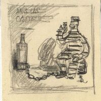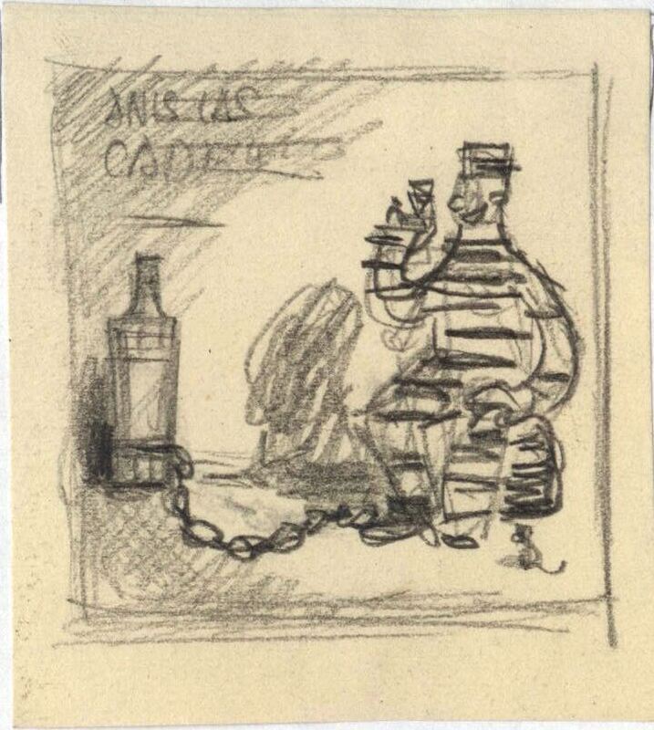 En este dibujo en el que destacan los colores negros y grisáceos se ha dibujado por medio de líneas abocetadas la imagen de un preso con un objeto en su mano derecha que levanta, mientras su brazo izquierdo se apoya sobre una pierna. A una de sus piernas hay una cadena atada en cuyo extremo se encuentra, también atada, una gran botella. Un pequeño ratón a la izquierda observa la escena.