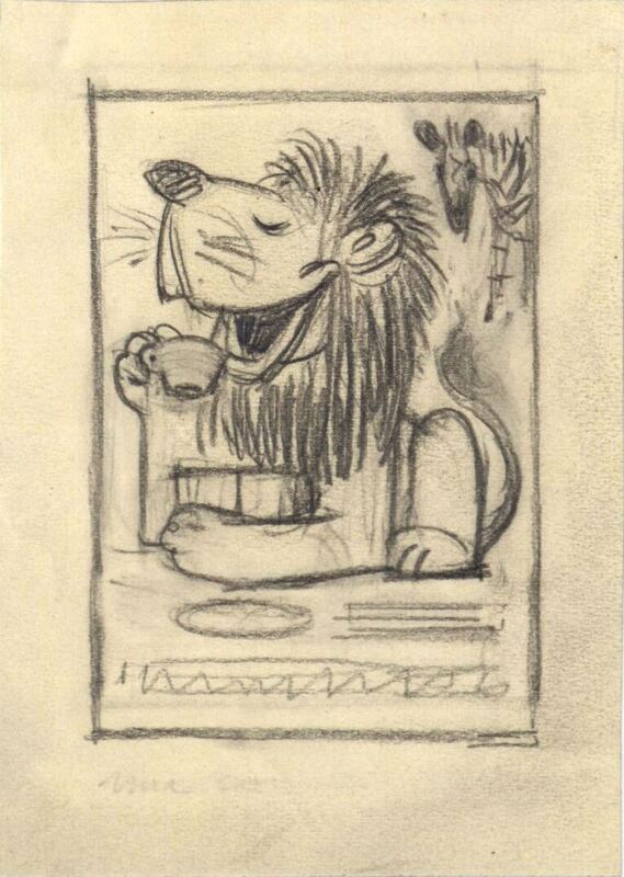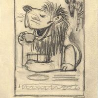 - En este dibujo enmarcado en donde destacan las líneas de colores oscuros se ve la figura de un león con gran cabellera, tumbado tomando una taza de té y abriendo la boca enormemente.
