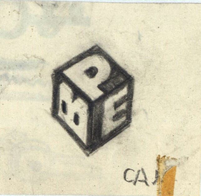 - Un dado negro y blanco con las letras “BPE” en cada lado es la imagen central de este dibujo. La palabra “can” acompaña la figura en la parte inferior.