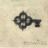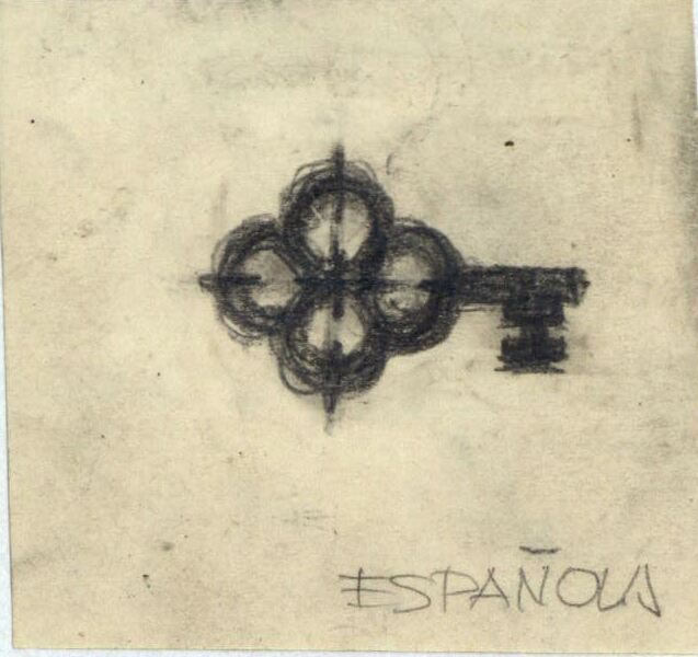 - De color negro y en el centro de la composición se destaca en posición horizontal la figura de una llave. La palabra “española” acompaña al objeto.