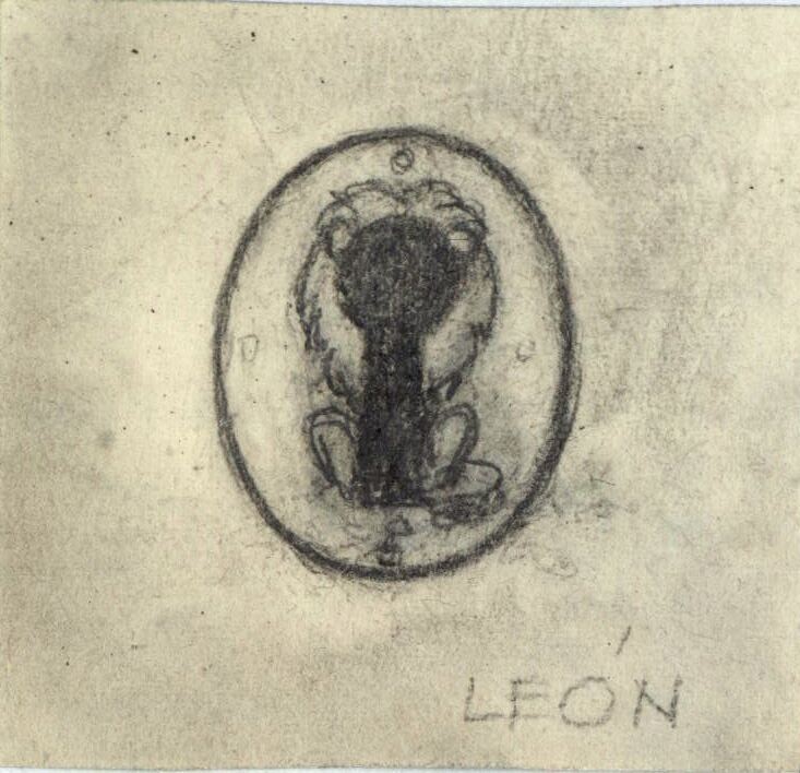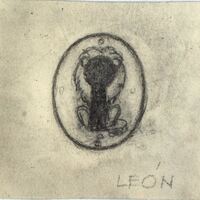 - Bajo el lema de “león” en el centro del dibujo se representa la imagen de un pequeño león, de cuerpo negro, cabellera blanca y de espalda alrededor del que se ha dibujado una circunferencia. Destacan las líneas en tonos oscuros.