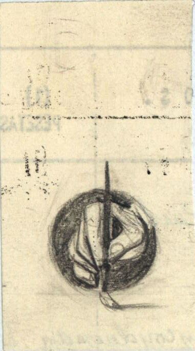 - Sobre fondo amarillo y en la parte inferior destaca una mano sosteniendo un pincel inscrita en una circunferencia cuyo fondo es negro.