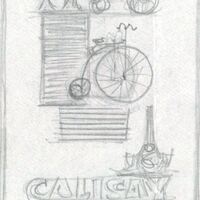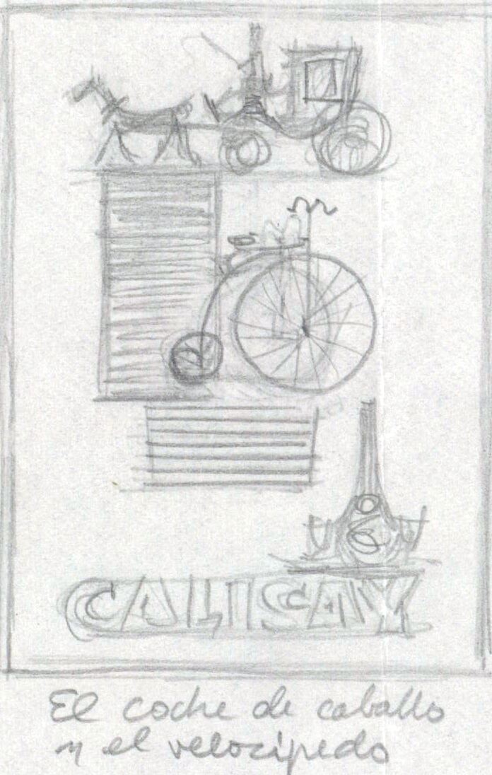 - Separados por dos figuras rectangulares en posición vertical se destacan un carro de caballos conducido por su cochero y un poco más abajo un velocípedo. En la parte inferior se encuentra la palabra “calasay”. Una línea horizontal separa el dibujo del lema. Destaca el color blanco grisáceo.