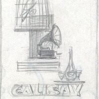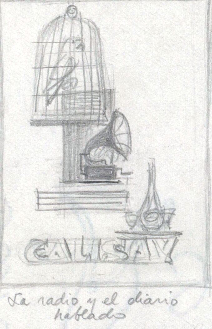 - En la parte superior destacan un gramófono y una jaula en la que está metido un loro. La palabra “calasay” se vislumbra en la parte inferior del dibujo en el que una línea lo separa de la frase del lema. Destaca el color blanco grisáceo.