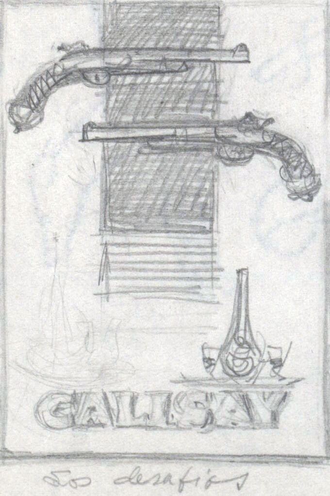 - Sobre una figura rectangular en la parte superior se destacan dos pistolas en posición horizontal. Con letras mayúsculas se destaca, inferiormente, la palabra “calasay”. Una línea horizontal separa el dibujo del lema.