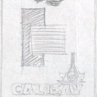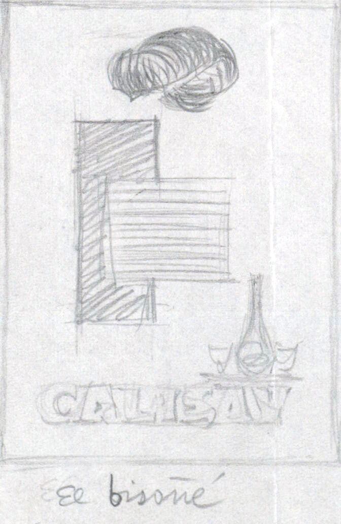 - Dos figuras rectangulares, una negra y otra a rayas, colocadas horizontal y verticalmente, respectivamente y una mancha negra se destacan en la parte superior. Inferiormente se ve la palabra “calasay”. Una línea horizontal separa el dibujo del título de la composición. Destacan el color blanco grisáceo.