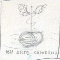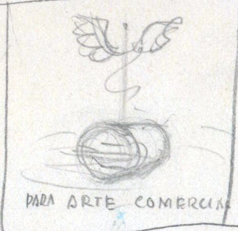 - Se ha representado en este dibujo a dos figuras circulares de las que se eleva una línea vertical en la que sobresalen en su parte superior, a cada lado, unas alas. Destaca el color blanco grisáceo. Líneas abocetadas a modo de enmarque rodean la figura.