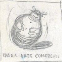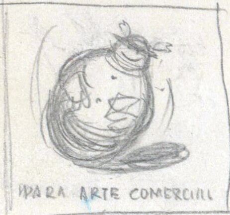 - “Para un arte comercial” se ha representado un muñeco de formas redondeadas como si se balancease en el dibujo. Destaca el color blanco grisáceo.