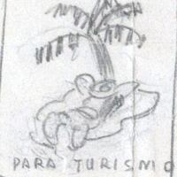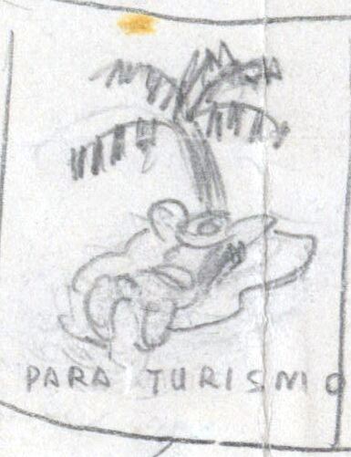 - En la composición donde destaca el color blanco grisáceo se ha dibujado en el centro la silueta de una isla con palmeras en la que se encuentra un hombre tumbado. Líneas abocetadas intentan enmarcar el dibujo.