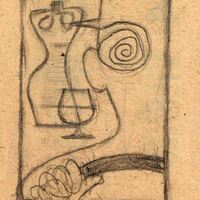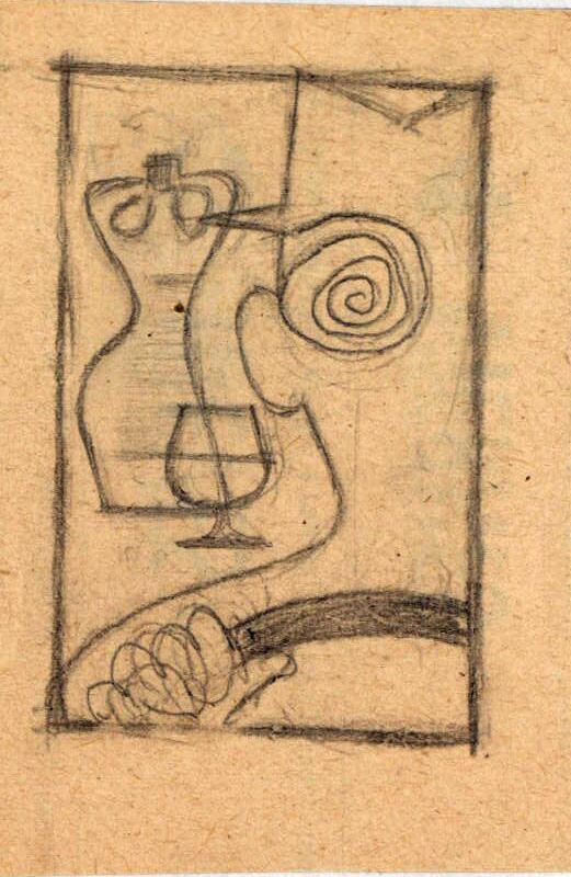 - Enmarcado en este dibujo se representa la silueta de un hombre al volante de un coche con sombrero y un ojo creado por líneas circulares mientras que en segundo plano se ve una botella y una copa. Destacan líneas negras sobre un fondo amarillo.