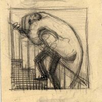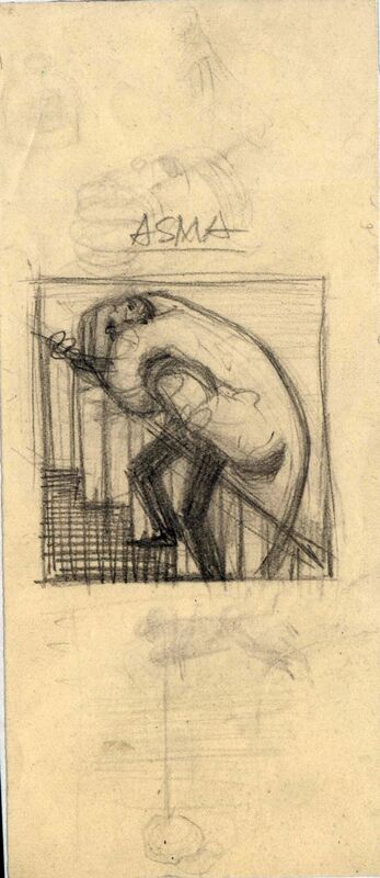 - Bajo el lema de asma se representa enmarcado en el dibujo a un hombre que apoya su cuerpo sobre una escalera mientras una gran mano blanca le agarra por detrás. Destacan líneas en tonos oscuros sobre un fondo amarillento.