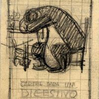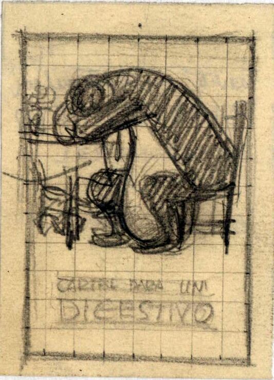- En el “cartel para un digestivo” y sobre una superficie cuadriculada se aprecia en el dibujo enmarcado la figura de un hombre sentado y apoyando su cabeza sobre una mesa. La figura se halla de perfil y destacan las líneas en tonos oscuros sobre un fondo amarillento.