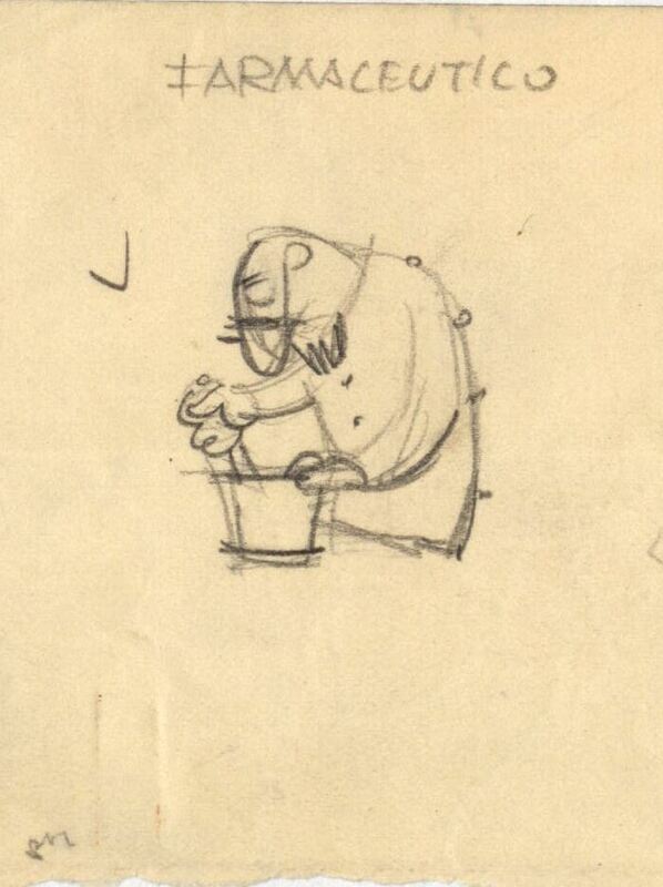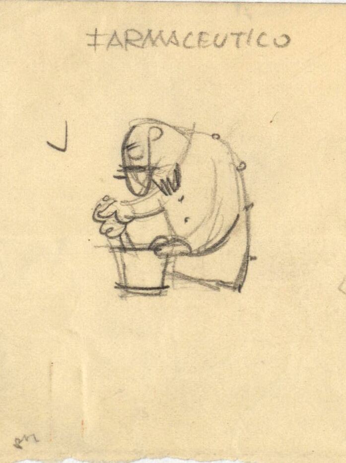 - Bajo el lema de “farmacéutico” destaca en el centro de esta composición un hombre que realiza una receta médica. El hombre se encuentra de perfil.