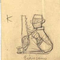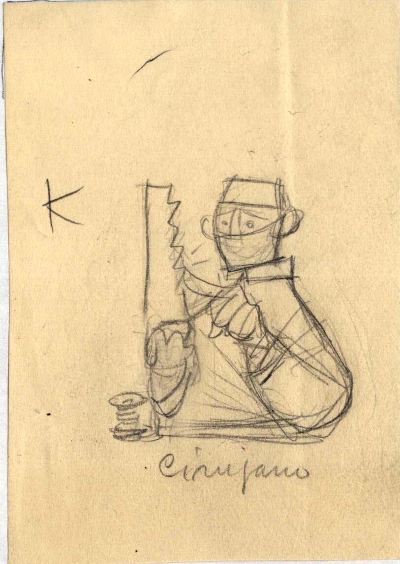 - Un cirujano observa vestido con su bata blanca una sierra sobre la que pasa sus dedos. Sobre fondo amarillo destacan las líneas oscuras.