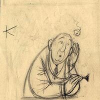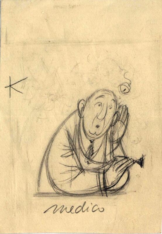- Un médico con su bata y su aparato de oír el corazón hace ademán de pretender oír algo y pone su mano izquierda en su oreja. La figura se halla en el centro de la composición sobre un fondo amarillento.