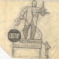 Sobre un fondo amarillento se representa la imagen de un camarero vestido con un traje de chaqueta blanca, al igual que su camisa, mientras que los pantalones adquieren un tono gris. Lleva en su mano izquierda una bandeja con bebidas y en la derecha un paño blanco. Bajo esta figura se vislumbra una pancarta, donde hay un hombre apoyado, con la frase “¡alto! Restaurante. Beba licor Calisay” en color negro.