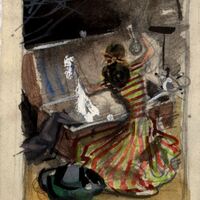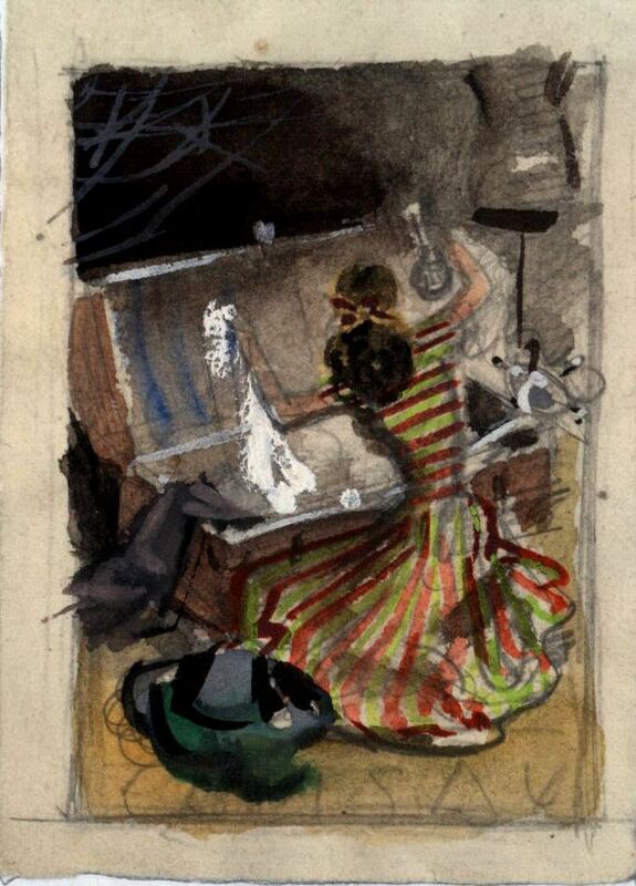 - Una mujer con un vestido largo, verde con rayas rojas, pelo negro y largo está sentada en el suelo observando detalladamente los objetos de un baúl de los recuerdos abierto de color marrón. Este es el tema central del dibujo enmarcado en el que apreciamos diversos objetos por el suelo.