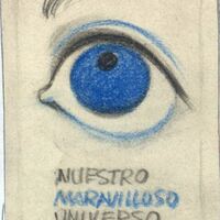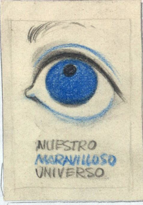 - En el dibujo ligeramente enmarcado y sobre un fondo claro se representa la imagen de un ojo azul que mira hacia arriba. Debajo del dibujo destaca el lema de “nuestro maravilloso universo” en letras negra y azul.