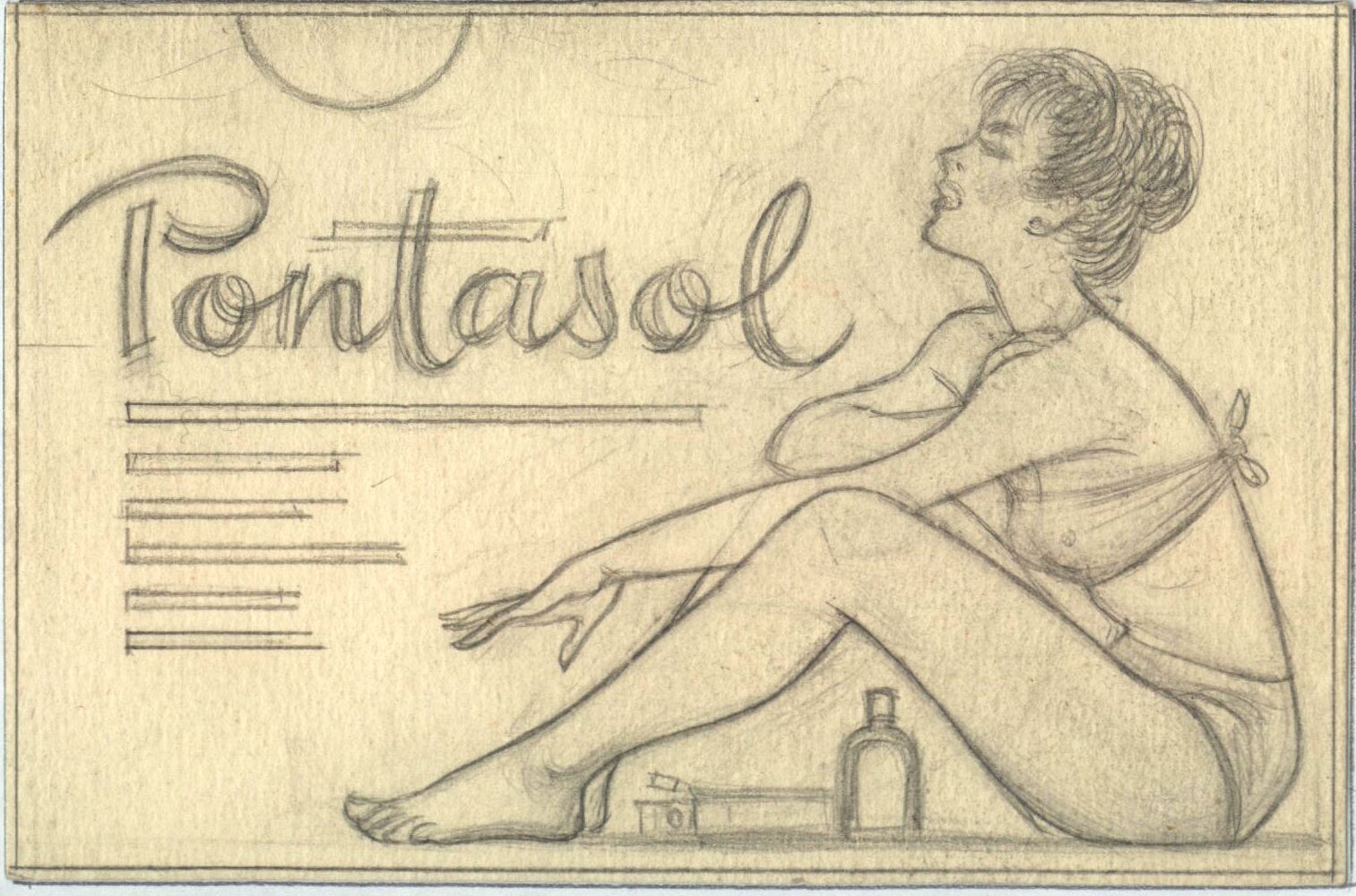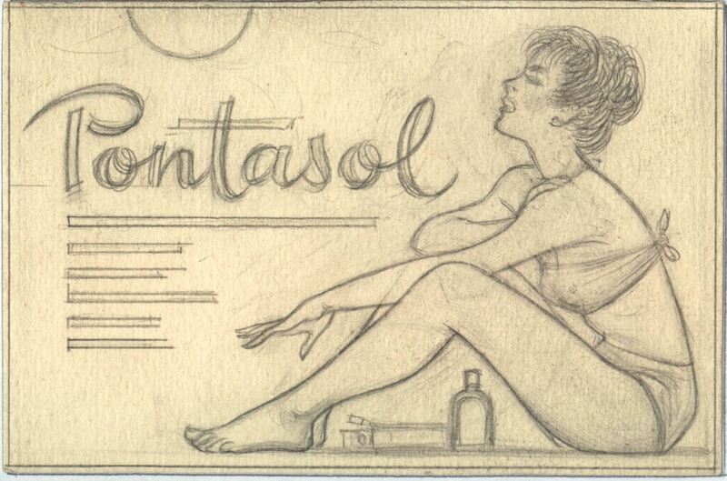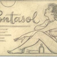 - Bajo el lema de “pontasol” subrayado con varias líneas horizontales se ha dibujado, en primer término, a una mujer con pelo corto, sentada y de perfil con un traje de baño. Debajo de sus piernas que arquea hacia arriba se ven frascos de cremas. En el dibujo predominan los colores grises sobre un fondo amarillento.