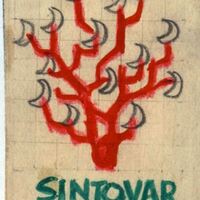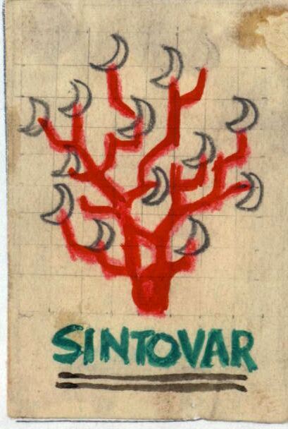 - Con el nombre de “sintovar” en verde se ha representado sobre un fondo cuadriculado la imagen de un árbol rojo en cuyas ramas cuelgan pequeñas lunas blancas con su silueta negra.