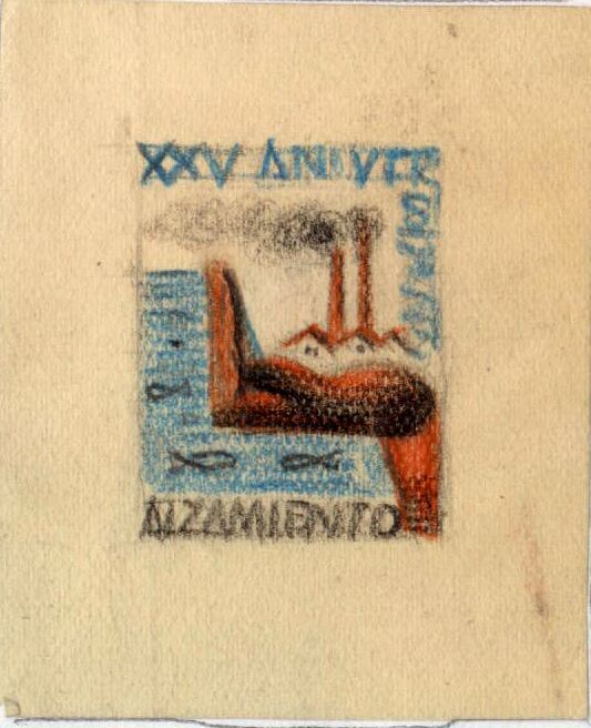 - Sobre un fondo claro se ha dibujado en un enmarque pequeño el paisaje de una zona industrial y un río con peces. Las frases del lema rodean la imagen por arriba en color azul y en la parte inferior en color negro.