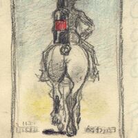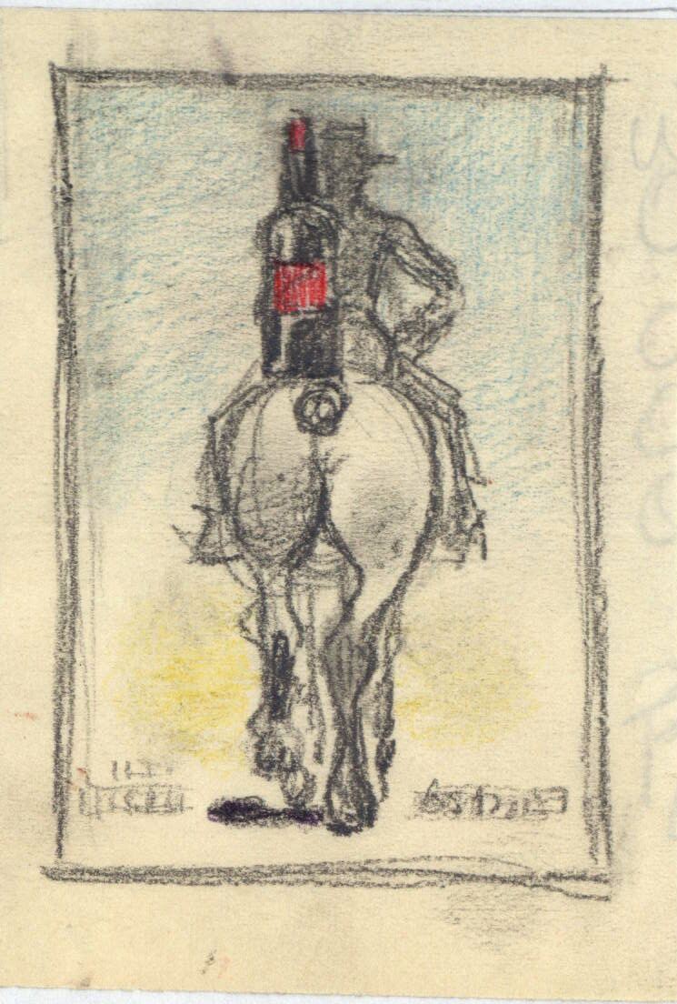 - En este dibujo enmarcado se ve un caballo blanco de espalda llevando a lomos a su jineta y detrás una botella negra de vino. En el fondo del dibujo destacan tonos azules y amarillos muy tenues. Hay inscripciones abocetadas en la parte inferior de difícil lectura.